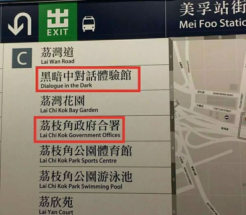 我们乘穗港直通的大巴,在香港太子道下车,搭地铁荃湾线,4个站到美孚,这个地铁站的出口指引有DID体验馆的标识,与“荔枝角政府合署”同列。